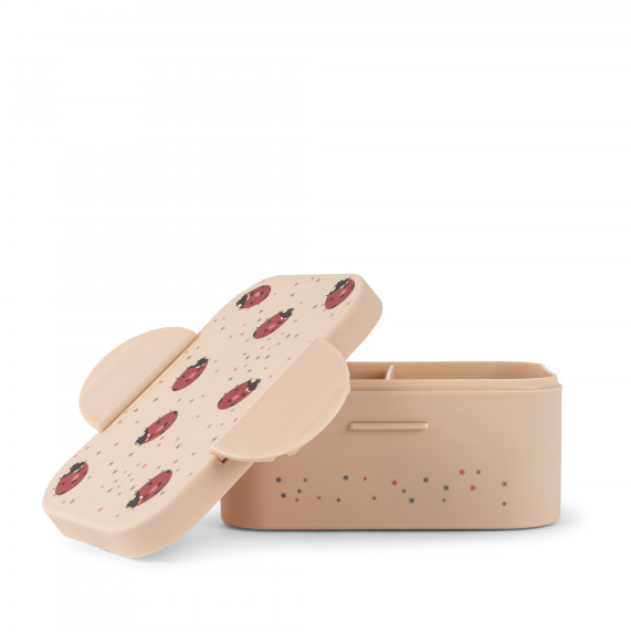 A cute box for storing food when you go for a walk or a trip with your little one. The box has a practical partition and a small container inside. The airtight seal allows the food to stay fresh for a long time.