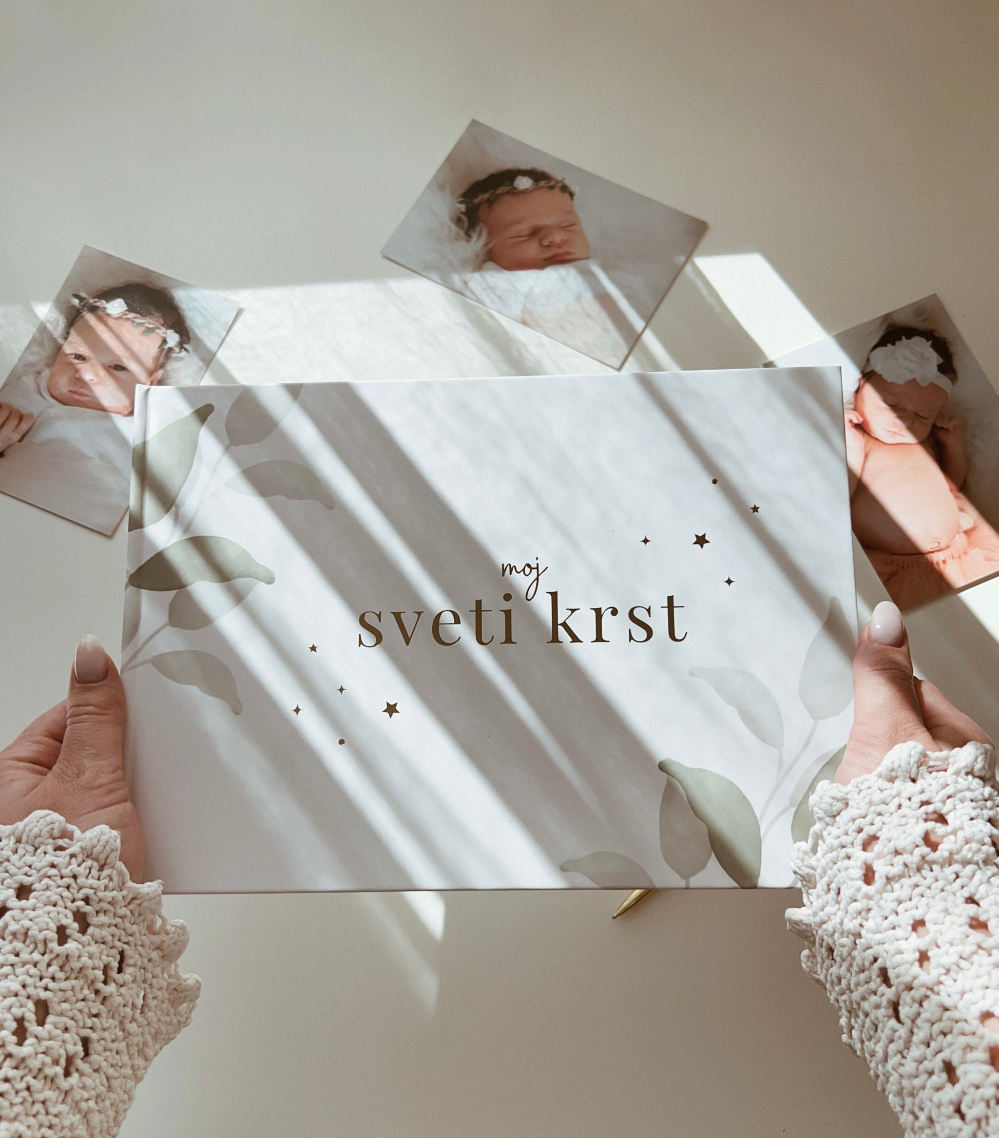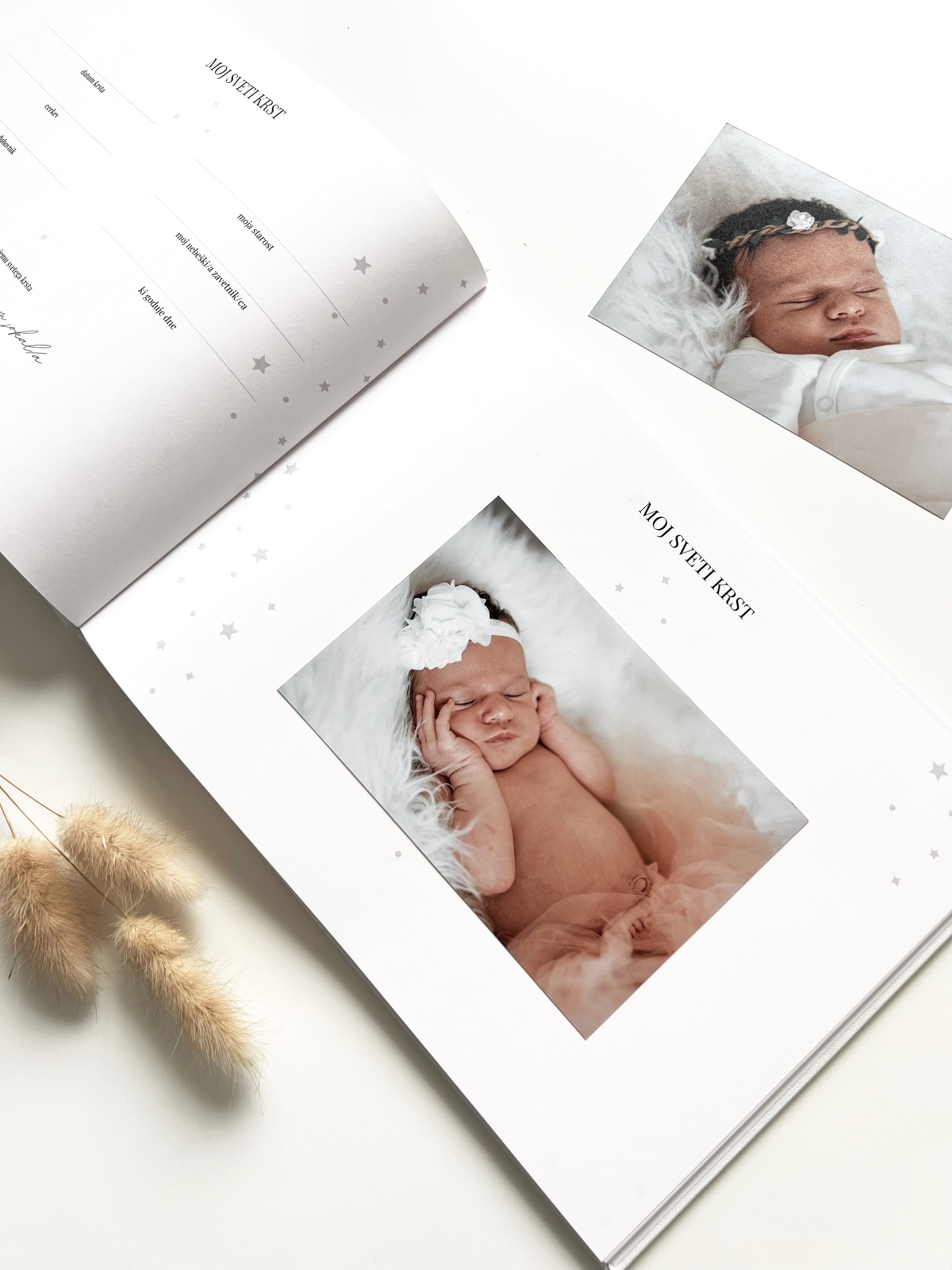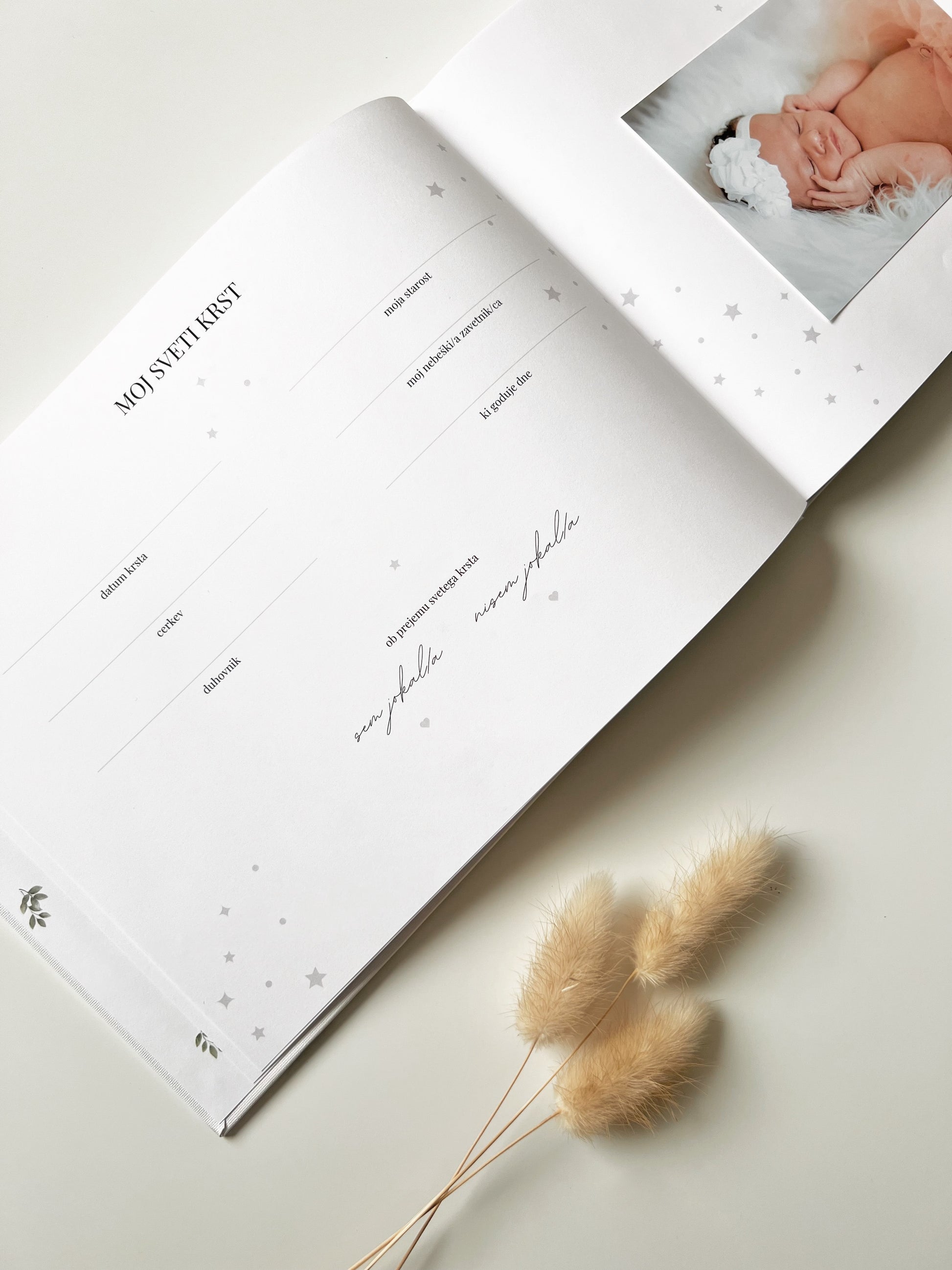 Odkrijte čarobnost trenutka in večno shranite spomine na sveti krst vašega otroka. Praznovanje svetega krsta bo še bolj posebno s to čudovito spominsko knjigo, ki obenem služi kot knjiga gostov. Vsak gost bo lahko v tem albumu zapisal svoje najlepše misli, voščila in spomine na ta poseben dan.
