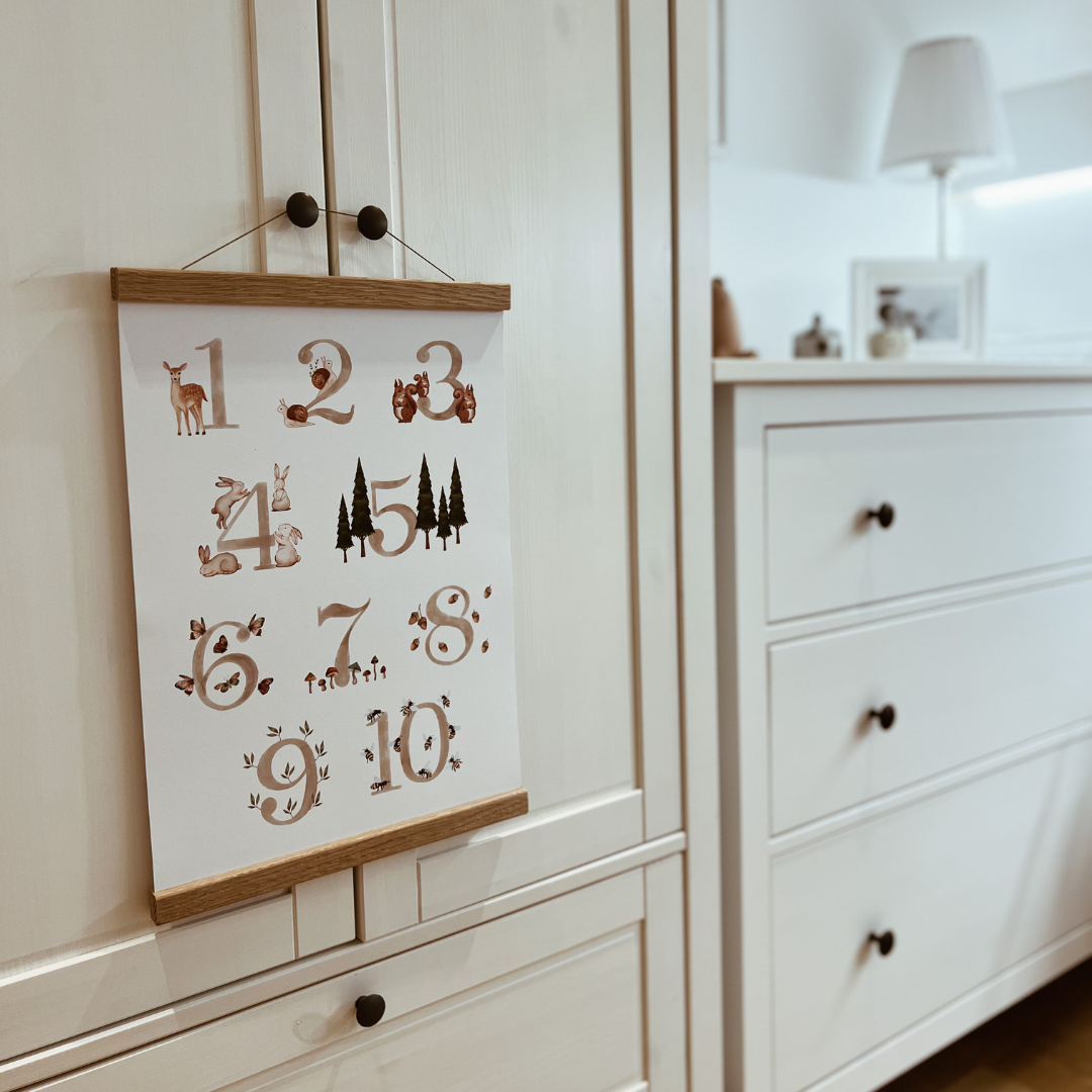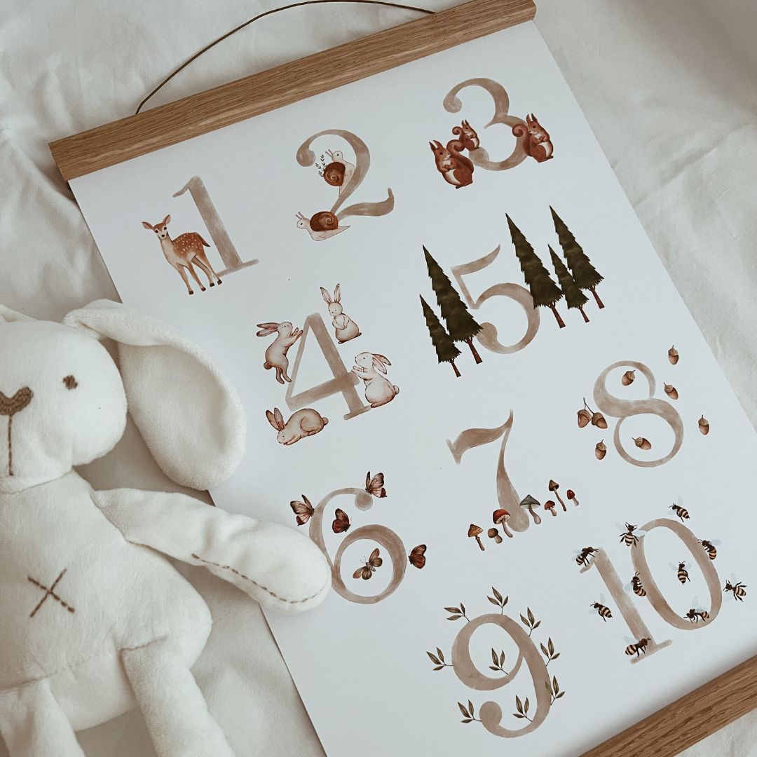Čudovit print, ki bo krasil sobico vašega malčka in hkrati pripomogel k poznavanju številk. Odlična ideja tudi kot darilo. Primeren za fantke in punčke.